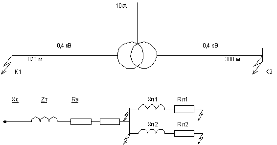 Составляем упрощенную расчетную схему сети напряжением 0,38 В, затем схему замещения.