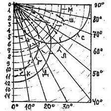 Распределение светового потока в пространстве характеризуется кривыми силы света. Особое значение имеют эти кривые для нижней полусферы. ГОСТ.13828-75 установлены следующие основные типы кривыхсилы света (рис. 25): К - концентрированная, Г- глубокая, Д - косинусная, Л - полуширокая, М - равномерная, Ш - широкая, С-синусная