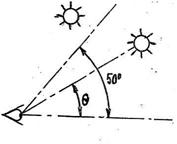 Одной из существенных характеристик светильников является «защитный угол», который ограничивает слепящее действие источника света. (рис. 1. 8- угол, определяющий положение в поле зрения слепящей яркости (Например: солнце). Если 8≥50˚, то ослепление невозможно, так как луч « слепящей яркости» не попадает в зрачок глаза. Естественный «защитный угол» зависит от размеров помещения и высоты установки светильников.