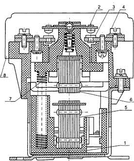 4 - приєднувальний затискач; 5 - сердечник; 6 - якір; 7 - поворотна пружина; 8