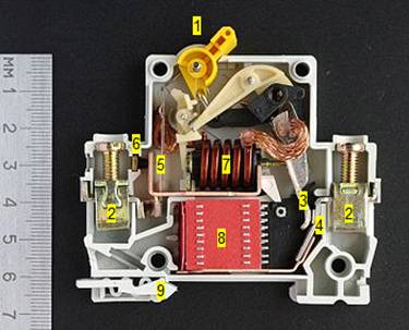 Під час розчеплення контактів може виникнути електрична дуга, тому контакти мають особливу форму і знаходяться в дугогасильні камері (8).