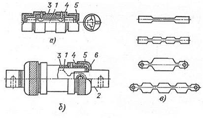 ПР-2 - запобіжник розбірний. Ці запобіжники випускаються на номінальні струми від 6 до 1000 А і номінальну напругу до 500 В. Знаходять застосування як в установках постійного, так і змінного струму. Корпус запобіжника представляє собою герметичний круглий патрон, виконаний з газогенеруючих матеріалу (фібри), мал.2,4 а. Він складається з циліндра 3, латунної обойми 4 і латунного ковпачка 5. Плавка вставка 1 штампується з цинку, має одне або кілька звужень (залежно від номінальної напруги), мал.2,4 в). При відповідному струмі плавка вставка плавиться в місці звуження і виникає електрична дуга. Під дією високої температури дуги стінки патрона виділяють гази (водень, вуглекислий газ). Тиск у патроні за частки напівперіоду піднімається до 4-8 МПа. Під дією газового середовища підвищеного тиску дуга швидко гасне. Плавка вставка 1 притискається до латунної обоймі 4 ковпачком 5, який є вихідним контактом, мал.2,4 а). У запобіжниках на струми більше 60 А плавка вставка 1 приєднується до контактних ножам 2, мал.2,4 6).