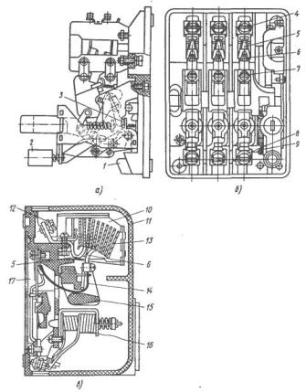 У більшості випадків, коли треба усунути дефекти різьби контактів, дугогасительной решітки, очистити кіптява на внутрішній поверхні і деталях вимикача або замінити поворотну пружину, достатньо обмежитися частковим розбиранням. Для цього вивертають гвинти кріплення кришки до основи 1 і кришку знімають. Знімають дугогасительную камеру, расцепляются важіль 3 (якщо вимикач зведений), натиснувши для цього на кнопку «стоп» 2 або рейку траверси вивідних проводів. Для подальшого розбирання вивертають гвинти 7 і знімають нерухомий 5 і рухливий 6 контакти.