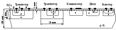 Характерная особенность полупроводниковых ИС состоит в том, что среди их элементов отсутствуют катушки индуктивности и тем более трансформаторы. Это объясняется тем, что до сих пор не удалось использовать в твердом теле какое-либо физическое явление, эквивалентное электромагнитной индукции.
