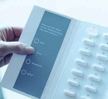 Помимо этого, микроэлектроника в упаковке имеет пьезоэлектрический датчик, генерирующий напоминания о времени приема очередной дозы. Технология, базирующаяся на проводящих красках, позволяет внедрить в упаковку опросный лист пациента. В него включаются вопросы, например: «хорошо ли вы спали сегодня?», « чувствуете ли вы улучшения?», «присутствуют ли побочные эффекты?», на которые пациент должен выбрать однозначные варианты ответов. Опросный лист активизируется после приема каждой таблетки, ответы совершаются нажатием соответствующих кнопок.