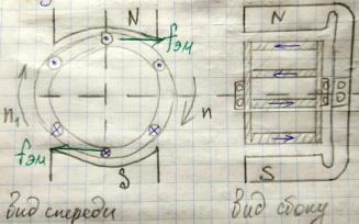Если вращать магнит с пост частотой n1, его магн поле пересекает стержни ротора и в них индуктир ЭДС (Направлен по правилу правой руки). Кольца и стержни явл-ся проводящими, поэтому в них появятся токи. При взаимод-ии этих токов с вращающимся магн полем возникают электромагн силы. Направлен сил по правилу лев руки. Эти силы создают электромагн момент М, под действ ктрого ротор начнет вращаться. По мере увеличен частоты вращен ротора n относительная скорость движения стержней в магнитн поле будет убывать.