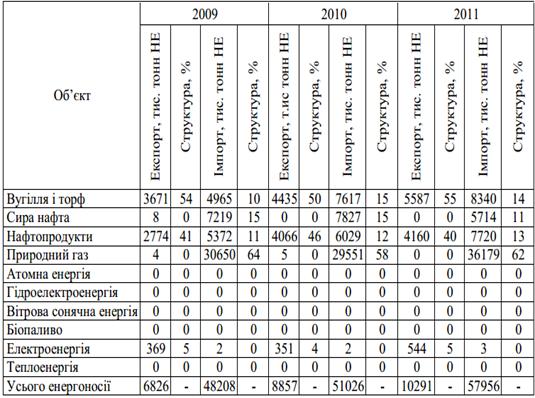 та імпорту енергетичних продуктів за 2009-2011 рр. та структуру кожного