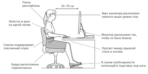 В качестве типичных ощущений, испытываемых к концу рабочего дня пользователи ПК, выступают такие: глазное переутомление, боль в голове, тянущие боли в мышцах шеи, рук и спины, уменьшение концентрации внимания.