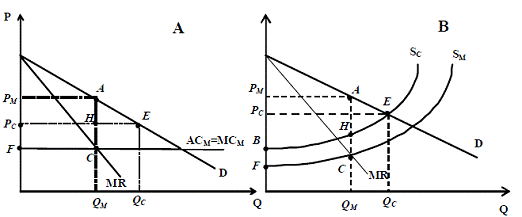 В соответствии с рисунком 1 представлена ситуация, когда фирма вследствие получения монопольной власти обеспечила экономию затрат, равную прямоугольнику FPCHC. Очевидно, что эта экономия перекрывает потери общества от неоптимального размещения ресурсов (треугольник HAE). В результате чистое благосостояние общества возрастает на разность этих площадей, которая и составляет выгоды от монопольной власти.