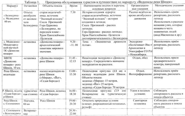 Следующим шагом является разработка программы обслуживания туристов в путешествии по маршруту «Водопады реки Шинок», представленная в таблице 1.