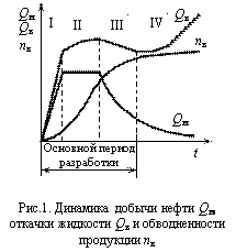 Стадия III (нисходящая ветвь) характеризуется значительным снижением добычи нефти и прогрессирующей обводненностью продукции (до 85 %). Граница между стадиями II и III устанавливается по точке перегиба кривой Qн при продолжающемся росте темпа откачки жидкости. Падение добычи неизбежно при отборе половины запасов углеводородов. Стадия IV завершающая, характеризуется низкими, но медленно снижающимися темпами отбора нефти при возрастающей обводненности скважинной продукции с большими темпами отбора жидкости и базируется на извлечении остаточных запасов нефти. Продолжительность стадии IV сопоставима с длительностью всего предшествующего периода разработки залежи и определяется пределом экономической рентабельности.