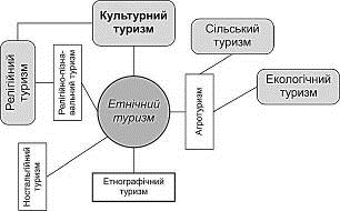 На наш погляд, етнічний туризм варто розглядати як один із різновидів культурного туризму, що пов’язаний із ознайомленням з традиційними культурно-побутовими особливостями життя населення дестинацій. У такому сенсі складовими етнічного туризму можуть бути етнографічний, релігійно-пізнавальний, ностальгійний, агротуризм та ін.