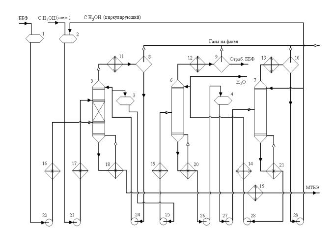 1, 2, 3, 4 – емкости; 5 – реактор; 6 – экстрактор; 7 - ректификационная колонна; 8, 9, 10 – сепараторы; 11, 12, 13 - конденсаторы-холодильники; 14 – 21 – теплообменники; 22-29