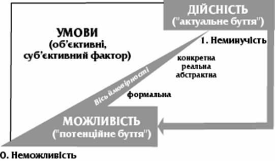 Можливість і дійсність. Ці категорії підкреслюють процесуальність, тобто виражають становлення буття. Як відомо, з нічого не виникає щось нове, воно може виникнути тільки за певних передумов, закладених у лоні старого. Буття нового в його потенціальному стані і є можливістю. Можливість – це філософське поняття, яке відображає об’єктивно існуючий і внутрішньо зумовлений стан предмета у його незавершеному, потенційному розвитку. Дійсність є філософська категорія, яка характеризує реалізоване, актуалізоване буття: дійсність є реалізованою можливістю.