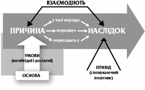 5) на взаємодію причини і наслідку впливають відповідні умови. Умови – це такі явища, які необхідні для виникнення певної події, але самі по собі її не зумовлюють. Серед умов можуть бути такі, які сприяють виникненню наслідку, а можуть бути й такі, що запобігають діям причини. Одна й та сама причина за певних умов викликає різні форми наслідків;