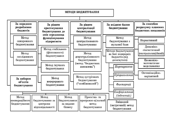 рівнем централізації - метод: централізований «згори вниз», децентралізований «знизу вгору», або метод бюджетних замовлень та комбінований;