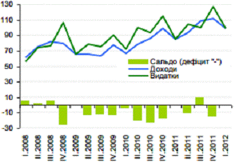 Зведений бюджет виконано з незначним дефіцитом (0.7 млрд. грн.), який було сформовано за рахунок місцевих бюджетів. Профіцит державного бюджету в І кварталі 2012 року становив 0.98 млрд. грн. Беручи до уваги суттєві обсяги видатків на обслуговування державного боргу (5.6 млрд. грн.), зведений бюджет мав первинний профіцит на рівні 1.7% ВВП. Це в свою чергу свідчить про помірну жорсткість бюджетної політики. Основним джерелом фінансування дефіциту залишалися запозичення. Джерел зовнішнього фінансування на фоні складної ситуації в Європі майже не було. Так із зовнішніх джерел надійшло лише 0.7 млрд. грн. на фінансування спільних з міжнародними фінансовими організаціями проектів розвитку. Тому Уряд у I кварталі продовжив запроваджувати нові інструменти на внутрішньому фінансовому ринку: ОВДП, номіновані в іноземній валюті - євро (розміщено 205.2 млн. євро відповідно), і використовувати раніше запроваджені інструменти. Так на первинному ринку розміщено: