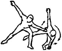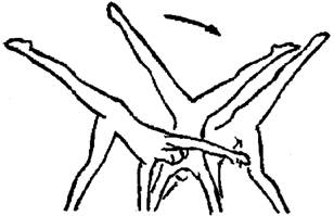 Переворот боком (колесо). Із стійки на правій нозі, ліва у бік перевороту, руки вверх - в сторони, зробити широкий крок лівою ногою убік, згинаючись в тазостегнових суглобах. Одночасно з махом правої і поштовхом лівої ноги по черзі спертися руками об підлогу і, пройшовши стійку на руках, прийти в початкове положення. При цьому ліву руку треба ставити ближче до лівої ноги, а праву ногу ближче до правої руки (рисунок 2.33).