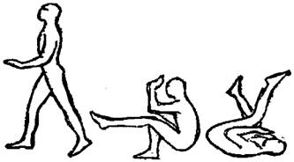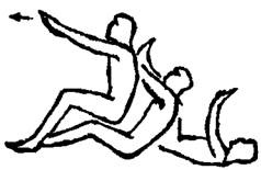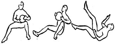 Падіння перекочуванням на спину або бік - одне з найбільш простих. Воно виконується з кроком вперед однією ногою, друга нога при цьому згинається і колінному і тазостегновому суглобах. Сідаючи на підлогу у п'яти зігнутої ноги (центр тяжіння за опорою), перекотитися через спину (рисунок 2.25) або бік так само, як при перекочуванні.