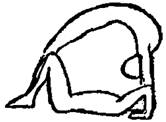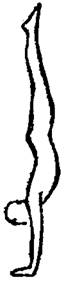 Стійка на голові. У упорі сівши перенести тяжкість тіла на руки, пружно поставлені попереду на ширині плечей, нахилитися вперед і упертися верхньою частиною лоба попереду рук так, щоб точки опори складали рівнобедрений трикутник. Зберігаючи рівновагу, повільно підняти ноги вгору в стійку з прямою спиною і прямими ногами (рисунок 2.22).