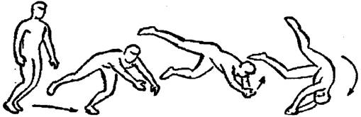 Перекид через плече. З кроком вперед спертися на однойменну руку, відштовхнувшись ногою, опуститися на плече, повертаючи голову, виконати перекочування і повернутися в початкове положення (рисунок 2.13). Цей перекид можна виконати з опорою однією рукою, обома і без опори руками.