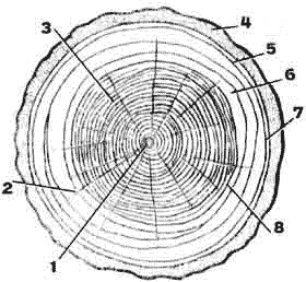 серцевинні промені, 3 - ядро, 4 - зовнішній шар, 5 - луб, 6 - заболонь, 7 -