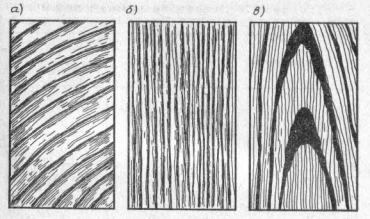 напрямку волокон від повздовжньої осі матеріалів, у зміні річних шарів,