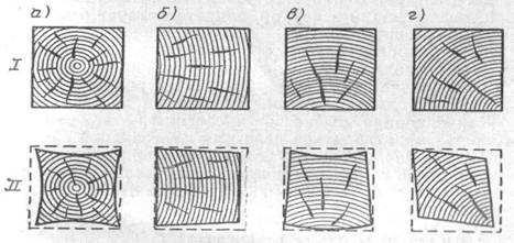 а, б, в, г - схеми усушки граней деревини в залежності від їх місця в стволі