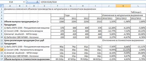 Динамика изменения объемов производства в натуральном и стоимостном выражении