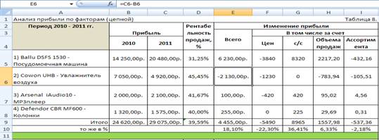 Поэтому рассмотрим общие изменения прибыли по факторам в период 2010 (базовый)