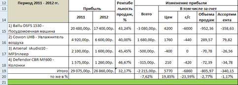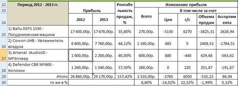 В 2012 году наблюдается спад из-за увеличения себестоимости за продукт (-23,59) и из-за уменьшения объема продаж (-2,77%). А 2013 г. оказался прибыльнее 2012 г., в основном из-за увеличения себестоимости (22,52%).