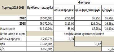 ) В третьей главе был проведен анализ прибыли предприятия по факторам и рассчитан коэффициент чувствительности. Расчеты коэффициента чувствительности за весь период с 2010-2013 гг. показывают, что прибыль предприятия ООО «Arsenal» наиболее чувствительна к объему продаж. Это самый высокий показатель из всех рассчитанных, следовательно, он характеризует наиболее перспективный путь развития организации для увеличения прибыли.