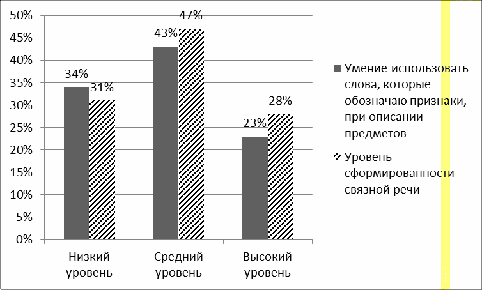 Уровень сформированности связной речи у 31% детей находится на низком уровне, у 47% на среднем и у 28% на высоком уровне. Дети не могли связать три картинки в один рассказ, описывали события, происходящие на каждой картинке, при этом рассказ начинался не с первой картинки, а в хаотичной последовательности.