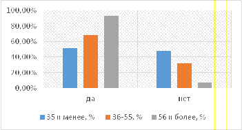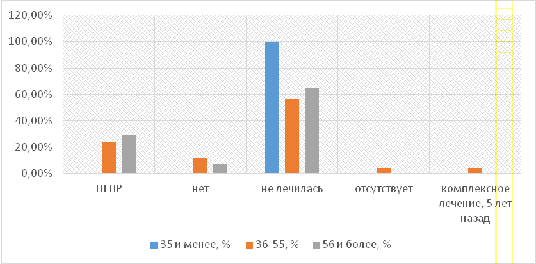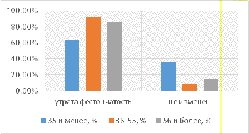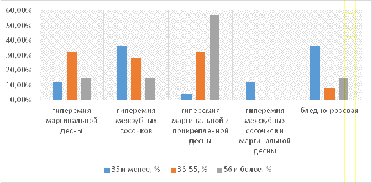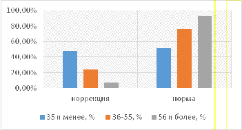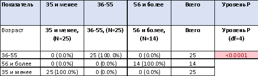 Все цифровые данные клинической части исследования обработаны методами вариационной статистики. Статистическая совокупность дробилась на группы согласно возрасту: 35 и менее лет (25 пациентов), 36-55 лет (25 пациентов), 56 и более лет (14 пациентов). Проверка различий между возрастными группами по количественным показателям проводилась с использованием критерия Краскелла-Уоллиса. Проверка различий между возрастными группами по номинальным показателям проводилась с использованием критерия Хи-квадрат.