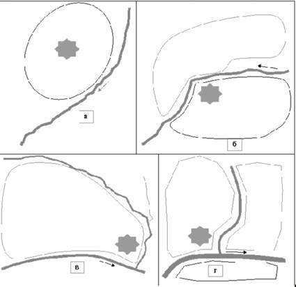 городов и положение центров: а - округлые; б - полукруглые; в - сегментные; г -