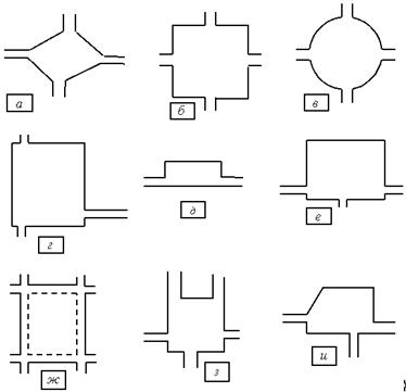 Площади, спроектированные по схемам д, е называют «площади-карманы». По назначению они относятся к разгрузочным. По схеме ж устраивают обычно рыночные площади. Они обеспечивают подход и подъезд со всех сторон. Площади, устроенные по схемам з, и удобны для образования площадей общественных центров.