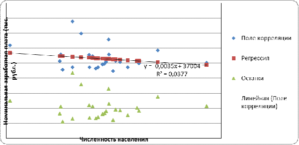 Коэффициент детерминации R2=0,038, говорит о том, что лишь 3,8% вариации (дисперсии, разброса) среднемесячной заработной платы объясняется изменением численности населения, а остальные 96,2% факторами, не включёнными в модель.