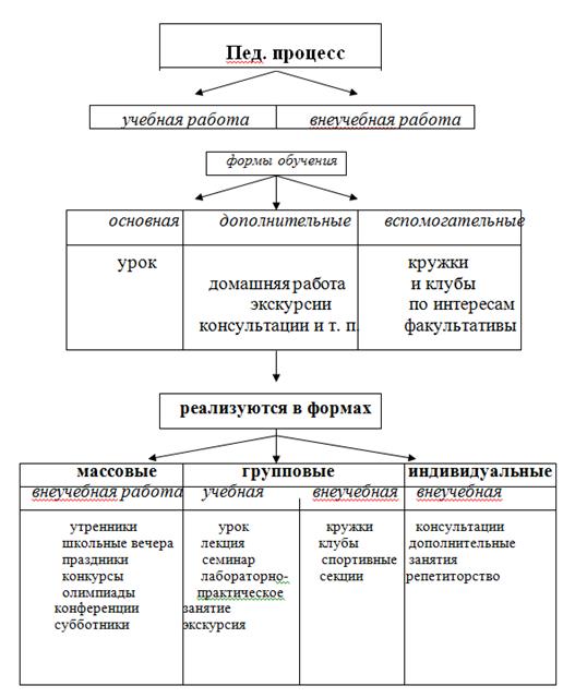 На протяжении длительного времени в педагогической литературе было общепринятым деление всех организационных форм на: