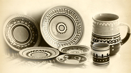 По видам разделок различают посуду, украшенную деколью, печатью, живописью.