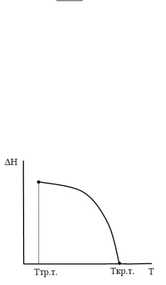Следовательно, теплота испарения уменьшается с ростом температуры. В уравнении Кирхгофа записана производная функции одной переменной – температуры. В данной форме оно справедливо в той области температур и давлений, в которой пар можно считать идеальным газом и энтальпия испарения практически не зависит от давления. С приближением к критической точке для многих веществ пар становится неидеальным газом (например, у воды давление критической точки 218 атм и пар нельзя считать идеальным газом), но характер температурной зависимости энтальпии испарения сохраняется.