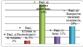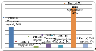 Згідно з показниками, значний відсоток респондентів - 24% відмітили популярність соціальних мереж. А 46% опитуваних мають різносторонній інтерес у проглядуванні сайтів та отриманні інформації.