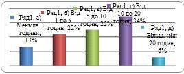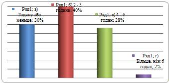 Більшість опитаних приділяють Інтернету від 10 до 20 годин на тиждень, в середньому перебуваючи в мережі близько 3 годин на день. Знову ж таки просліджується підвищення відсотку залежності від Інтернету.