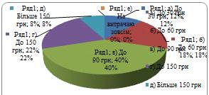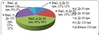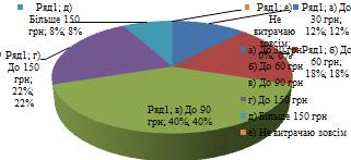Виходячи з результату - більша кількість респондентів (40%) витрачає на місяць близько 90 грн., що вже становить немалу кількість витрачених грошей. Інше частина опитаних - 12%, 18% та 22% відповідно,- витрачають на користування Інтернетом приблизно від 30 до 150 грн., а 8% навіть більше 150 грн. Це вказує на те, що немалі кошти користувачів Мережі йдуть на оплату за її «послуги».
