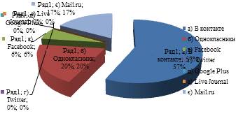 Однією з найпопулярніших соціальних мереж на сьогодні є «В контакті» - 57% опитуваних. На другому місці - «Однокласники» - 20%. Потім іде «Mail.ru» та «Facebook» 17% і 6% відповідно. З такими соціальними мережами, як «Twitter», « Google Plus», «Live Journal» респонденти майже не ознайомлені.
