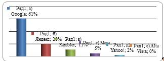 Як відомо, чим більше інформації та чим вона різноманітніша, тим складніше знайти потрібне, тим простіше «заблукати» у віртуальному світі. Тому без спеціалізованих систем пошуку необхідної інформації важко обійтися. Найбільшою популярністю серед опитуваних користується пошуковий сервер Google - 61%. На другому місці Яндекс - 20%. Також популярними є Rambler, Meтa, Yahoo!