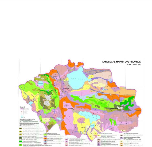 We drew a 1:1000 000-scale landscape map that shows these peculiarities of Uvs province and it sorted 28 types of landscapes in 16 typologies that represent mountains and relief landscapes.