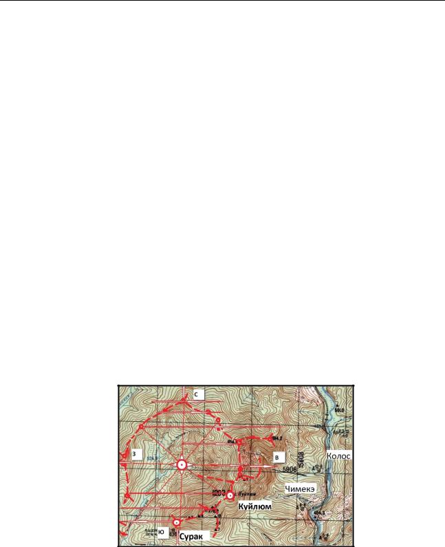На г. Куйлюм и её юго-восточной и южной сторонах обнаружены обелиски – менгиры (рис. 2). Вся система ориентирована по сторонам света на соответствующие господствующие вершины. Закреплённых направлений, проведённых через центр линий, насчитано 16, в числовых соотношениях - 2,4,8,16. В северном и южном секторах насчитано соответственно по 4 и 3 горизонтальных условных направления, делящих его на приблизительно равные части (рис. 1). На юге массива (г. Сурак) найдена вертикальная стена высотой до 40 метров с горизонтальной площадкой на её вершине. Западная, северная и северо-западная стороны комплекса с центральной его частью практически не исследованы.