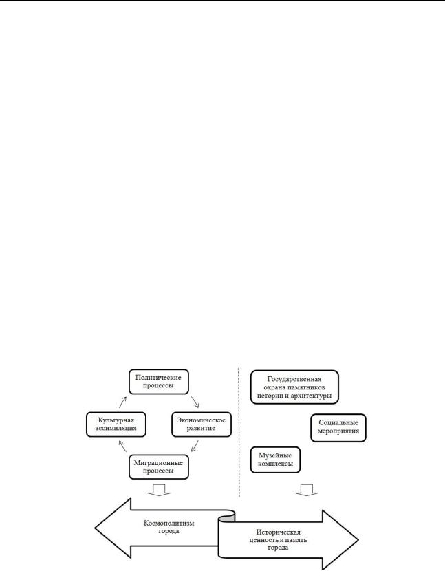 Особенность городских ландшафтов как категории наследия заключается в сочетании в себе нескольких типов культурных ландшафтов (селитебные, рекреационные, индустриальные, мемориальные и др.), что определяет интерес к их рассмотрению в качестве туристских ресурсов. Между тем их вовлечение в туристскую деятельность сопряжено с необходимостью определения баланса между современными процессами развития городского пространства, например, созданием комфортной туристкой инфраструктуры, и сохранением целостности и ценности исторически сложившейся структуры и духа города (рис. 1).