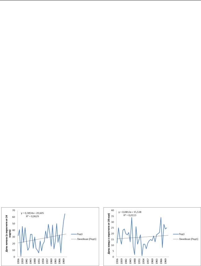 Графики хронологического хода дат конца весеннего сезона (рис. 2, 4, 6) в период с 1935 по 1970 гг. показали на тенденцию к смещению даты концы весны на более поздние сроки со скоростью порядка 0,08 дн/10 лет. Период с 2001 по 2013 гг. характеризуется наиболее интенсивным смещением даты окончания сезона к ранним срокам на 14 дней за 10 лет. Небольшое смещение даты концы весны к более ранним срокам отмечается и во втором изучаемом периоде – 3 дн./10 лет.