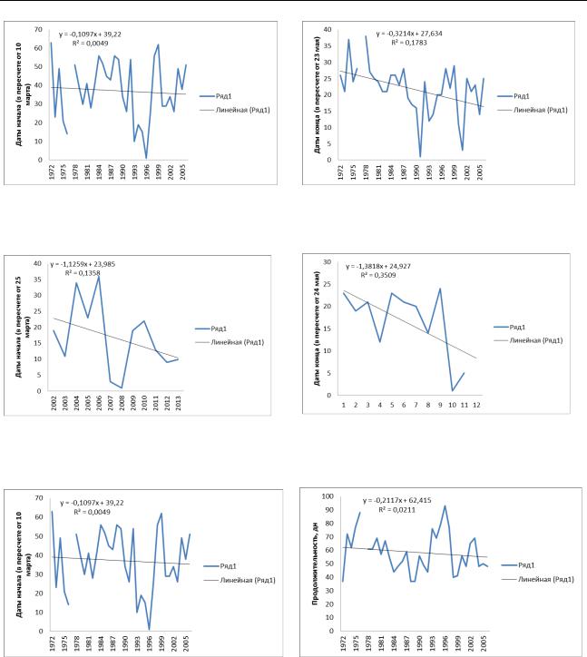 Также нами были построены графики хронологического хода (дат начала и конца весны, продолжительности), показаны линейные тренды, их уравнения и уровень достоверности (R²) за три периода (рис. 1-6) с целью выявления тенденции и скорости изменения временных оказателей.